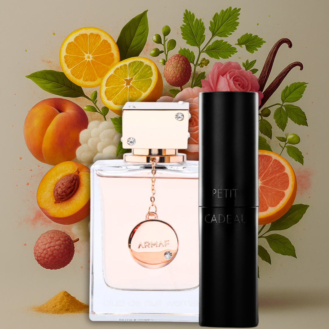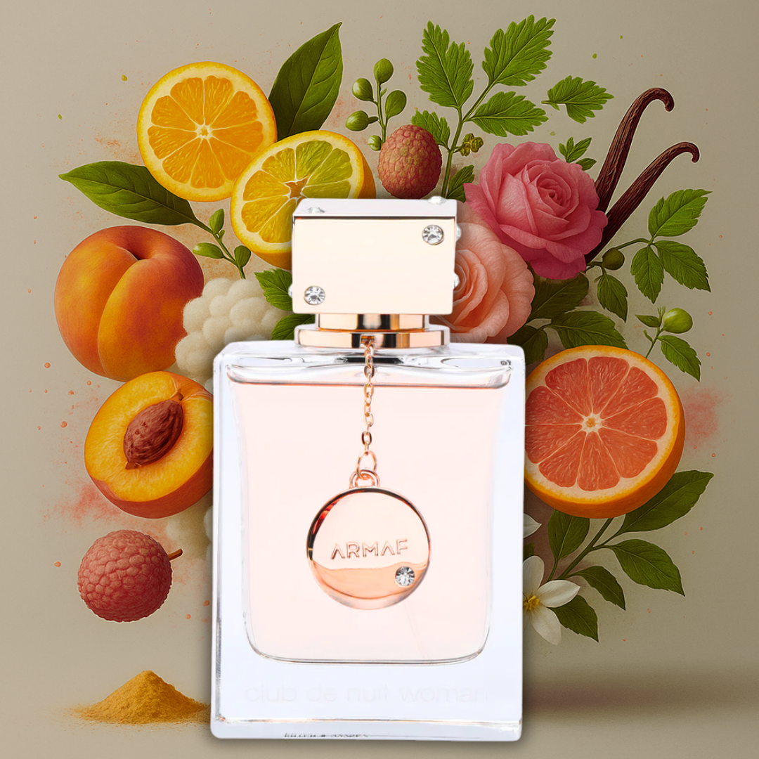 Club de Nuit Woman opent sprankelend met citrus en sappige perzik, fris en vol energie. Daarna ontvouwt het zich naar een vrouwelijk hart van roos, jasmijn en lychee — chique, zacht en verleidelijk. In de droogte ontdek je een mix van patchouli, muskus en zoete vanille die een warme en elegante basis vormt. Echt zó draagbaar, zonder overweldigend te zijn — topkeus voor vrouwen met stijl.