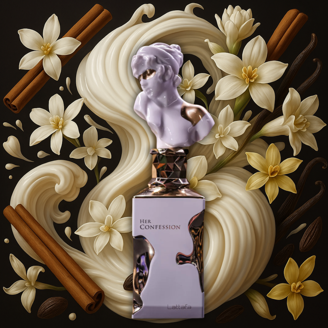 Lattafa Her Confession voelt alsof je een zachte cream latte drinkt in een strak, chic café. Het begint met een zwoele, mysterieuze swirl van rook en kaneel, roept vervolgens een bloemig-warm hart van jasmijn en wierook op, en eindigt in een romige finish van vanille en muskus. Het is clean, luxe en onweerstaanbaar vrouwelijk — ready voor werk, date-night, of een zondag op de bank.